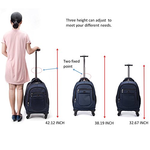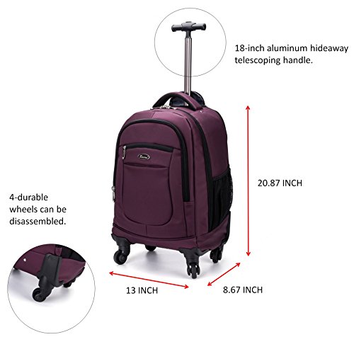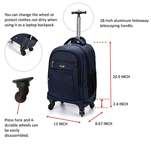 Specifications: Material: water-resistant durable nylon fabric Zipper: Dual-access zipper with anti-theft design Item size: 13*8.67*20.87 inch Package size: 13.31*9.8*22.28 inch Package weight: 6.7 lb Package: 1 x Wheeled Rolling Backpack