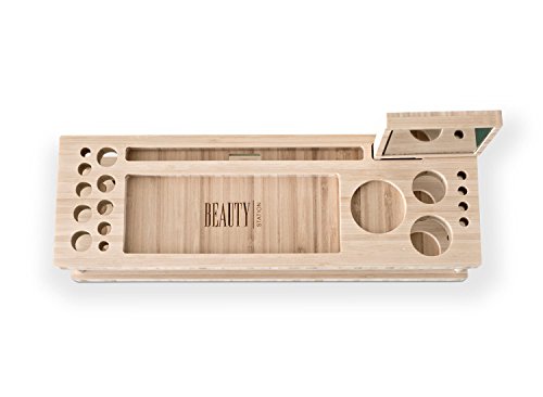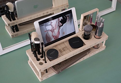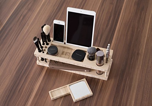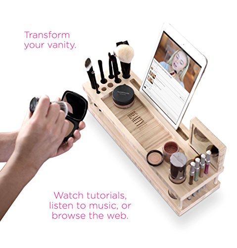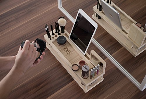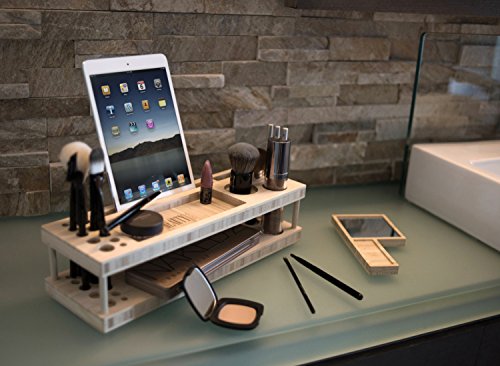 The Beauty Station is a complete makeup organizer, display center, and universal docking station for iPhone 5/6/6+, iPad, & most phones & tablets. The open and modern design provides display and viewing space for over 20 to 30 makeup products, including the hand mirror and multiple mobile devices. The Beauty Station is chiseled and handcrafted from natural, eco friendly bamboo. The product’s smooth surface is glazed with a protective, stain-resistant sealant.