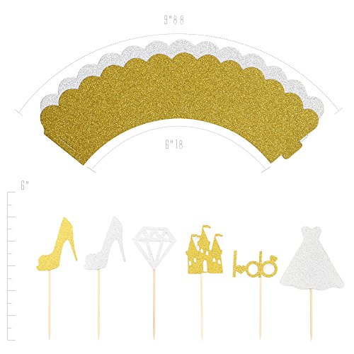 Yes I DO Package contents : ? * 1 ? ?Silver Wedding Dresses Topper ( 4"5H ) * 1 ? ?Golden "I DO" Pattern Topper ( 3"5H ) * 1 ? ?Silver Diamond Topper ( 4"5H ) * 1 ? ?Golden Castle Topper( 4"6H ) * 4 ? ?Golden High Heel Topper ( 5"H ) * 4 ? ?Silver High Heel Topper ( 5"H ) * 5 ? ?Gold Papper Wrapper (8"Lx2"H) * 7 ? ?Silver Papper Wrapper ( 8"Lx2"H ) 0 |