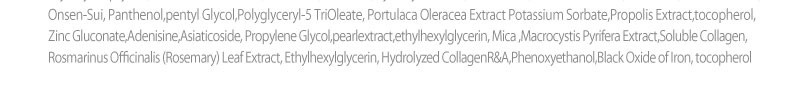 精製水、酸化チタン、メトキシケイヒ酸エチルヘキシル、シクロペンタ シロキサン、ブチレングリコール、ジメチコン、グリセリン、ラウリン酸ヘキシル、セチルPEG/PPG-10/1ジメチコン、ポリメタクリル酸メチル、パラメトキシケイヒ酸イソアミル、イソノナン酸イソトリデシル、ビスエチルヘキシルオキシフェノールメトキシフェニルトリアジン、酸化亜鉛、エチルヘキシルトリアゾン、硫酸マグネシウム、ジフェニルシロキシフェニルトリメチコン、安息香酸アルキル(C12-15)、ミツロウ、(カプリル·カプリン酸)グリセリル、黄色酸化鉄、(−)-α-ビサボロール、イソステアリン酸ソルビタン、オリーブ油脂肪酸ソルビタン、セスキオレイン酸ソルビタン、ジステアルジモニウムヘクトライト、ステアリン酸マグネシウム、(ジメチコン/ビニルジメチコン)クロスポリマー、トリエトキシカプリリルシラン、フェノキシエタノール、赤色酸化鉄、カルナウバロウ、(アクリレーツ/ジメチコン)コポリマー、カプリル酸グリセリル、 黒色酸化鉄、パンテノール、ひまわり種のオイル、ツボクサエキス、マイカ、マンニトール、スベリヒユのエキス、ビフィズス菌培養溶解質、ミネラルウォーター、オオウキモのエキス、アデノシン、グリチルリチン酸アンモニウム、1,2-ヘキサンジオール、アジア酸、アシアチコシド、トリオレイン酸ポリグリセリル-5、フェルラ酸エチル 、可溶性コラーゲン、ソルビン酸カリウム、カフェイン、マデカシン酸、グルコン酸亜鉛、プロポリスのエキス、乳酸、酢酸、ペンチレン グリコール、セイヨウトチノキ種のエキス、ローズマリー葉のエキス、カプリリルグリコール、真珠のエキス、エチルヘキシルグリセリン、加水分解RNA、トコフェロール