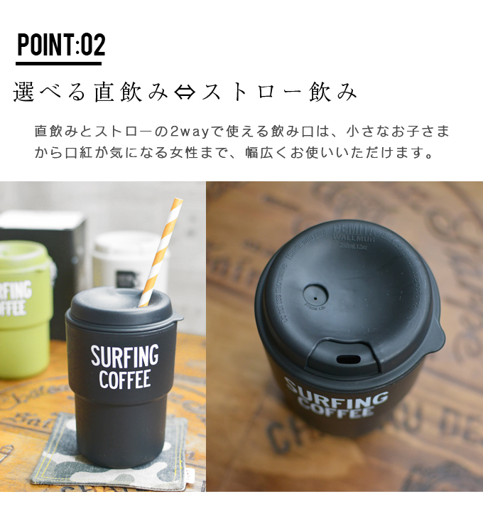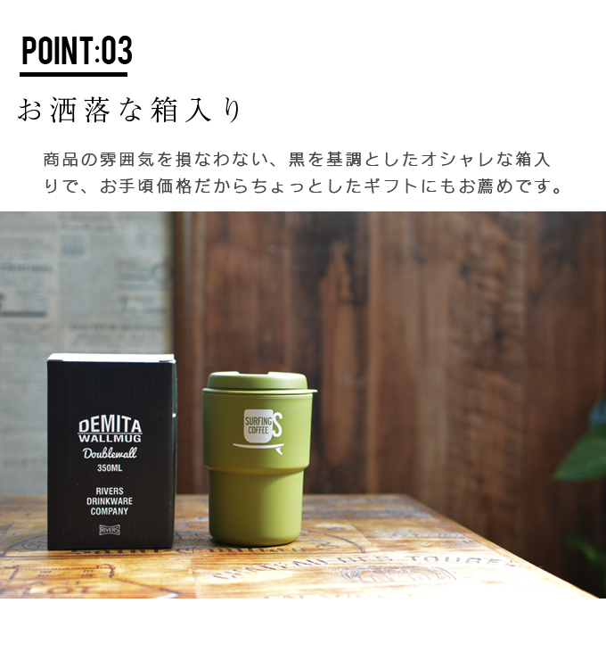 | ポイント | ポップ&スタイリッシュな「デミタ」は、テイクアウトカップ感覚で使えるダブルウォールタンブラー。 重さわずか100g&容量350mlに加え、マルチファンクションな魅力がたっぷり。 (1) 二重構造だからペーパースリーブ不要。ホットドリンクも安心です。 (2) 落としても割れにくい素材。 (3) 飲み口が選べる2 WAY LIDはストローも使えて、小さなお子さまから口紅が気になる女性まで幅広くお使いいただけます。 (4) フタは簡単に分解でき清潔に保てます。 |