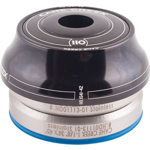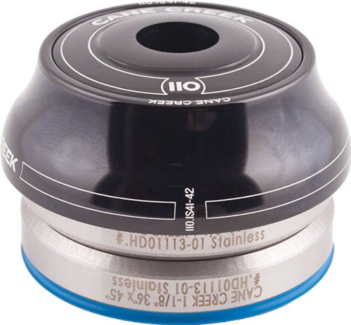 Studio : Cane Creek Publisher : Cane Creek Product Description With the 110 Headset, Cane Creek entered territory long held by Chris King at the top of the aftermarket headset heap. But where King refuses to approach the integrated headset, Cane Creek has an easy run at domination. This Cane Creek 110-Series Integrated Headset takes a cost-is-no-object approach to manufacturing. With their 110 Headset, you get something so beautifully well-made that it has a full 110 year warranty. And with Cane Creek showing that kind of confidence in their product, it's more of a bargain than you might initially think.The 110-Series Integrated Headset is made with the lowest-friction, sealed stainless steel cartridge bearings available. Furthermore, the individual balls are 5/32" -- oversized by headset standards -- in order to minimize rolling resistance (i.e. giving it added smoothness) and to increase durability. The cartridge bearings are sealed with what Cane Creek likes to call a Split Lip Seal, which has two contact seals per side to better keep out contaminants and hold in grease. To augment the seals on the cartridge bearings, Cane Creek adds seals to the crown race and top assembly. For what it's worth, Cane Creek recommends occasionally rotating the bearings -- top to bottom, bottom to top -- in order to lengthen bearing life since the bottom bearing gets about 90% of the wear tear in a headset. And since the bearings simply drop into the seats inside the head tube, they're easy to remove and re-install.The Cane Creek 110-Series Integrated Headset is a fantastic upgrade for any bike built with a 1-1/8" standard integrated head tube. It gives you performance no less sweet than what you get from a King NoThreadset. And, like King, it comes in numerous polished and anodized colors -- Black, Blue, Purple, Red, and Silver. The Clip-Seal in the upper assembly holds all the parts together, including the compression ring. This makes assembly a cinch, since there are no loose parts to misplace or install backwards. 0