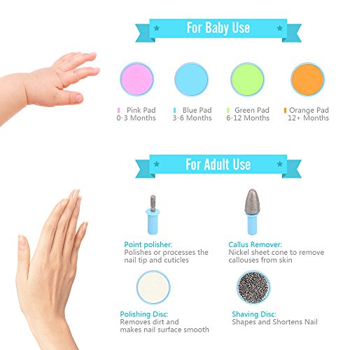 SUITS BOTH BABY and MOM: This baby nail clipper come with 4 cushioned sandpapers safe for babies (0 month to 12 months +)and toddler , as well as 4 attachments for adult use.