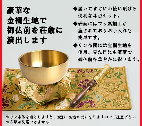 御仏前にふさわしい、荘厳で上品なデザインのリン4点セットです。リン本体は表面にフッ素加工を施し、お手入れも手軽で腐食しにくくなっています。