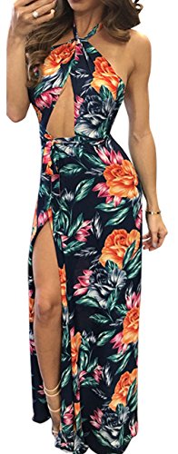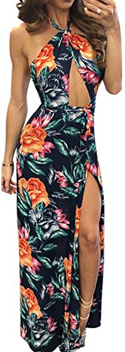 Women's Sexy Backless Halter Neck Vintage Floral Print Maxi Dress