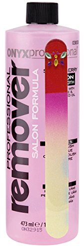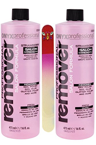 Onyx strawberry scented salon formula works great on removing nail polish, nail glue, glitter polish and more. Its unique salon strength formula is enriched with vitamin E and grape seed oil to condition nails. 16oz bottle comes with nail file.