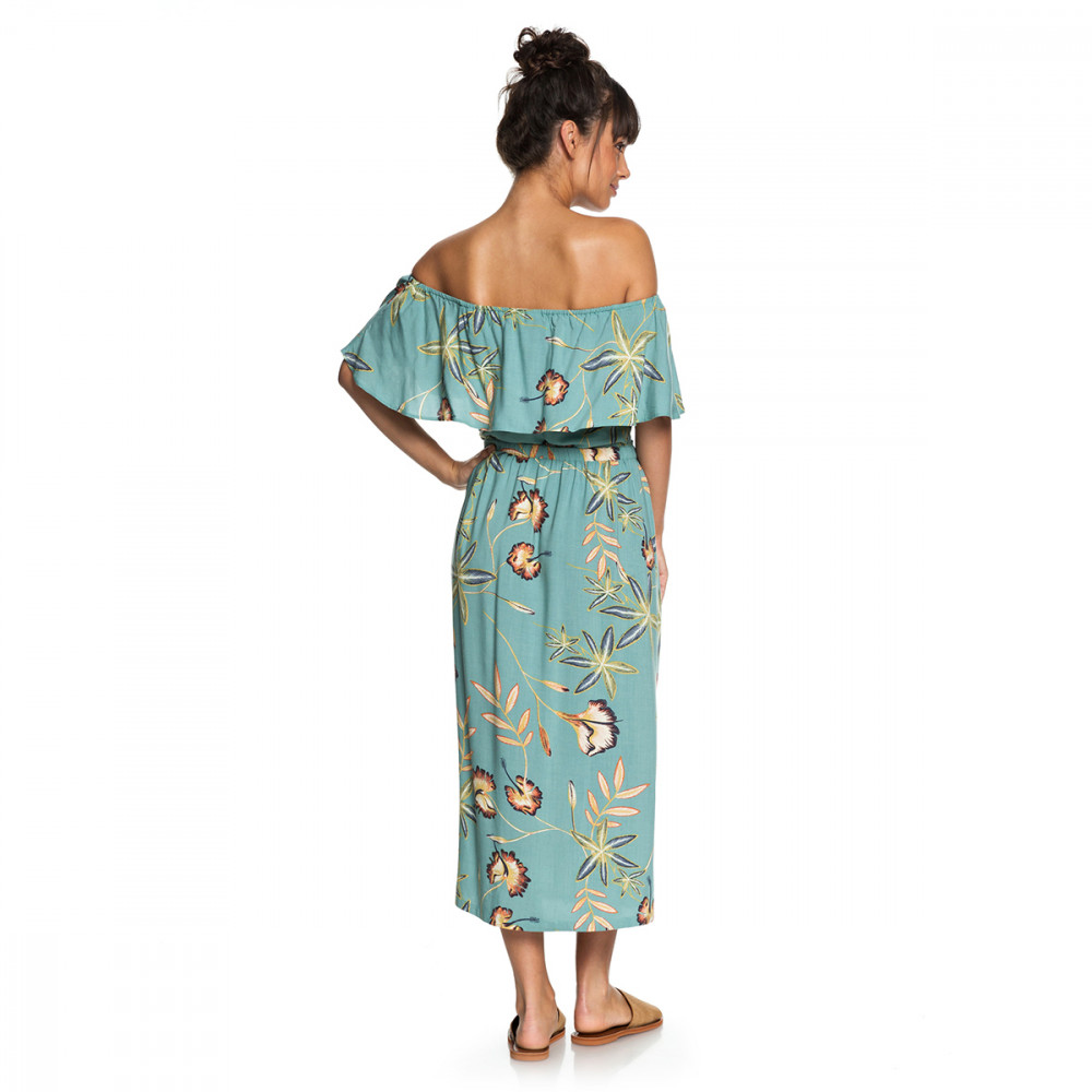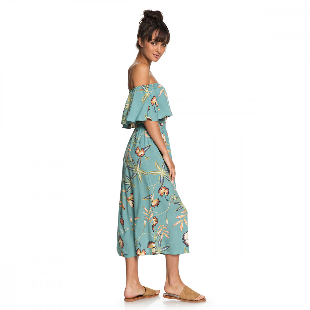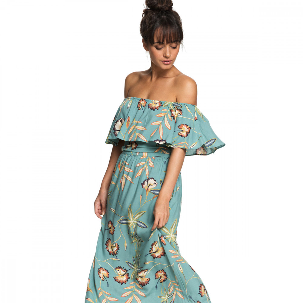 섬세한 프린트 패턴이 돋보이는 레이온 소재의 오프숄더 드레스. 고무줄 처리된 넓은 넥 오프닝에 러플이 장식되어 여성스러운 실루엣을 연출한다.
