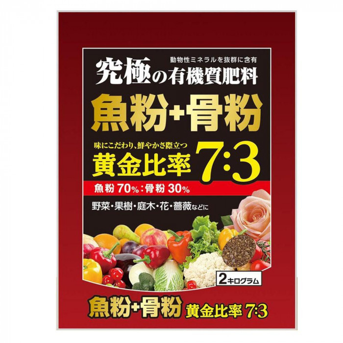 | 魚粉70%、骨粉30%を配合した、完全有機100%の肥料です。野菜や果樹はもちろん、庭木や花、薔薇にも最適です。粉状品。 |