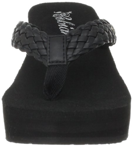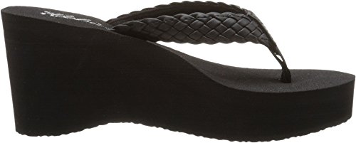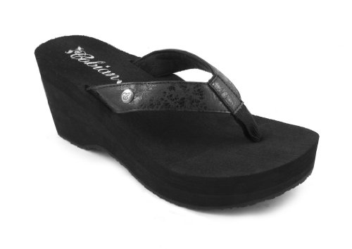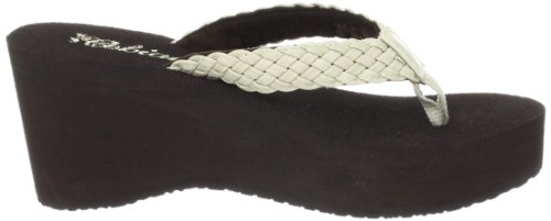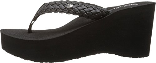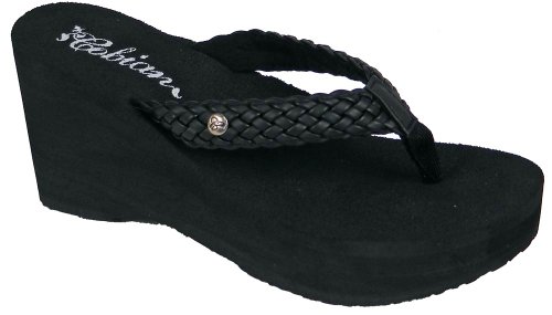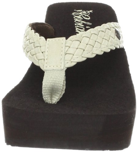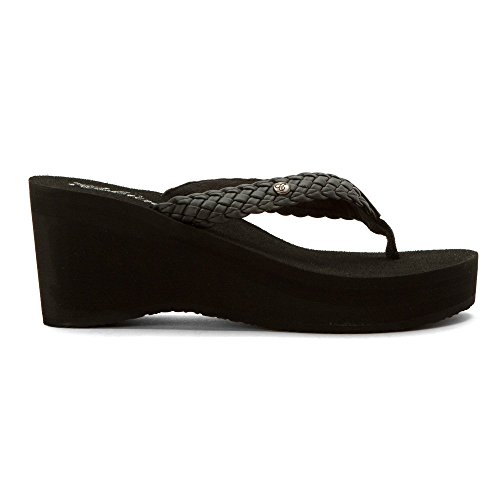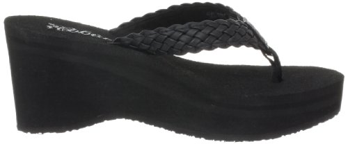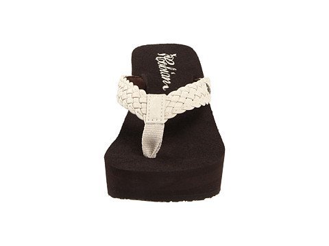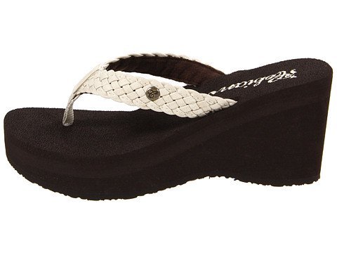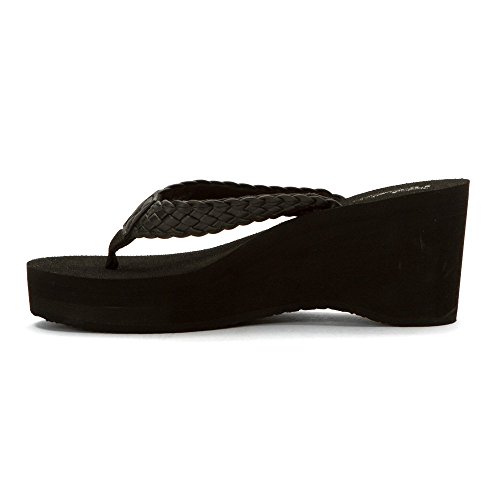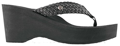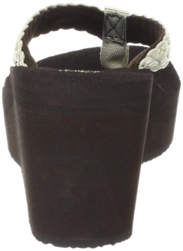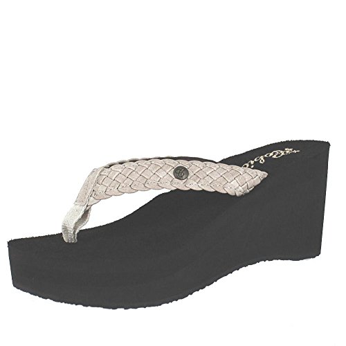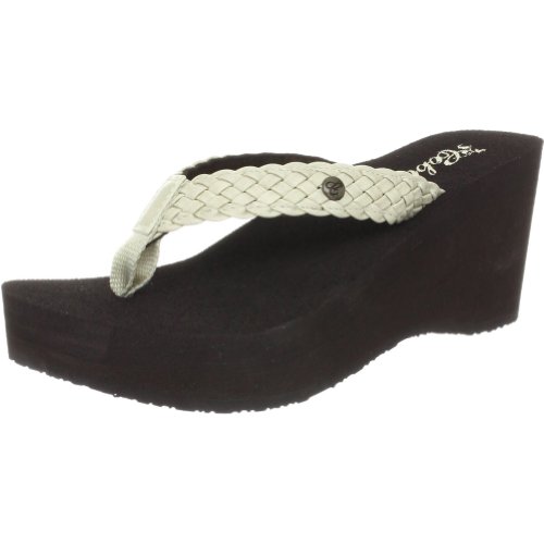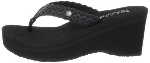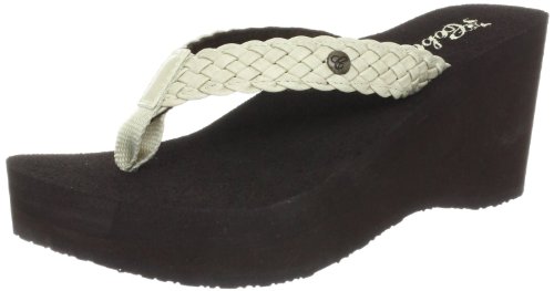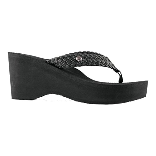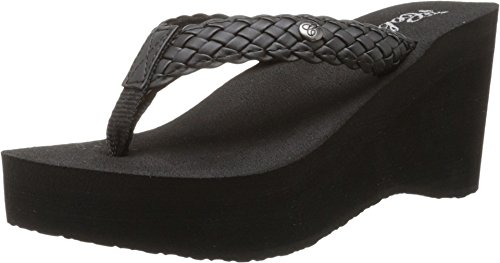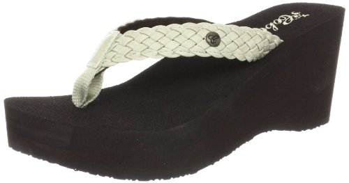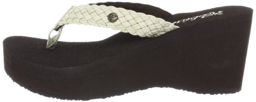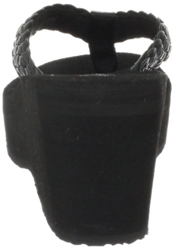 Soft braided synthetic strap with metal icon surftique detailSquishy EVA topsole with anatomical arch supportHigh fashion wedge
