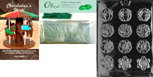 Cybrtrayd MdK50GRBk-F051 Round Flower Mints Fruits and Vegetables Chocolate Candy Mold with Chocolatier's Bundle, Includes 50 Cello Bags, 50 Green Twist Ties and Chocolatier's Guide