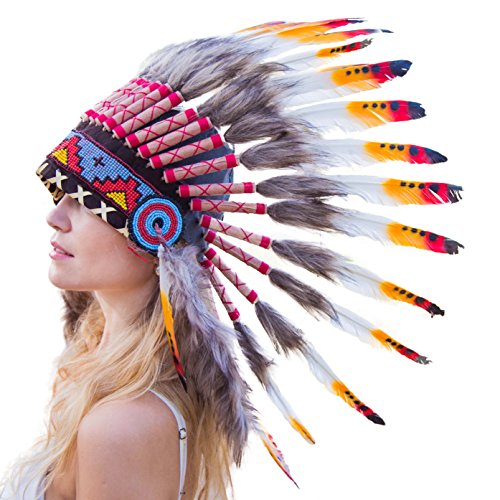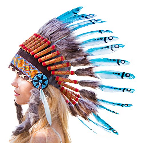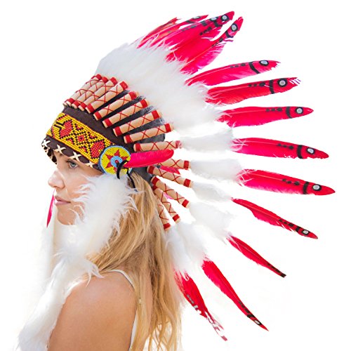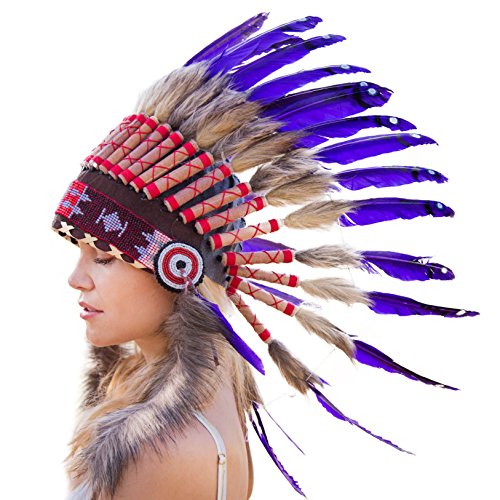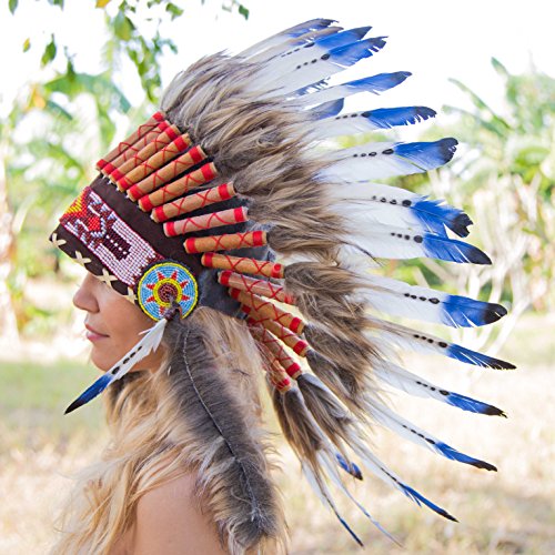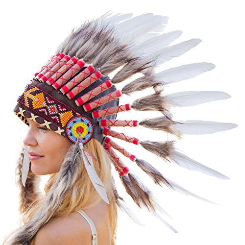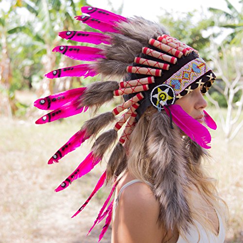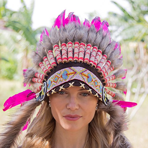 This beautiful Indian Style Headdress is handmade and features stunning and 100% authentic feathers as well as a stylish Native American Style beadwork in the front. The beads on the forehead can vary in color and design as we try to keep every headdress unique. It can be worn to various occasions. All headdresses are made by Balinese artisans. You can browse our full selection by clicking on our shop at the top under "Novum Crafts".Feature