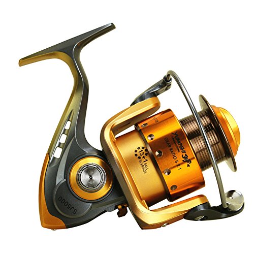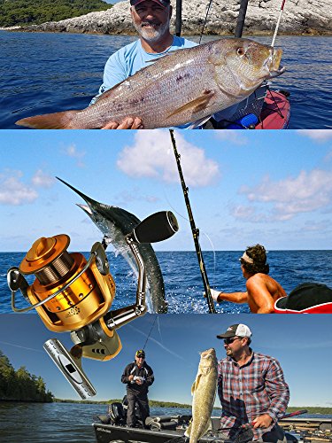 STRONG - this spinning reel is equipped with: precision brass gears, hardened metal main shaft, triple disc carbon drag washers, and interchangeable right or left CNC machined aluminum handle.