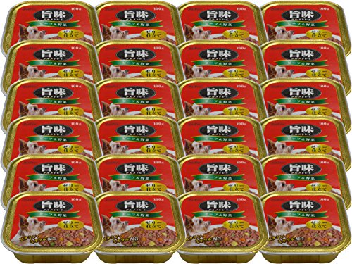原材料:肉類(チキン、ビーフ)、でん粉類(コーンスターチ)、野菜類(にんじん、グリーンピース、じゃがいも)、食塩、増粘安定剤(カラギナン)、ミネラル類(Cu、Zn、Ca、Fe、Mn)、ビタミン類(B1、D、E)、保存料(亜硝酸ナトリウム)、着色料(三二酸化鉄)