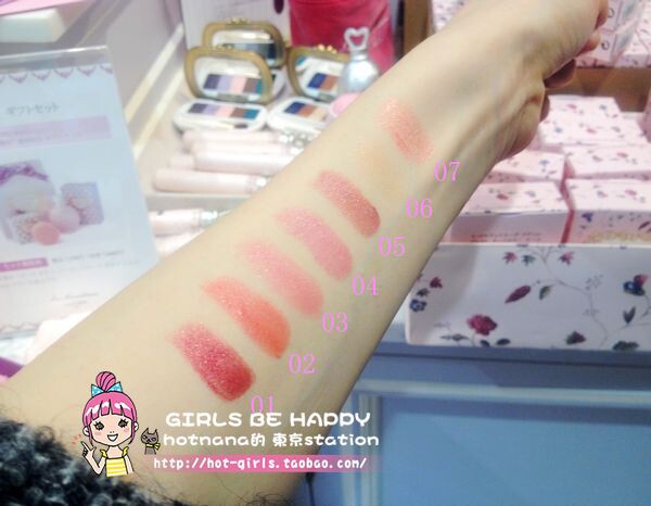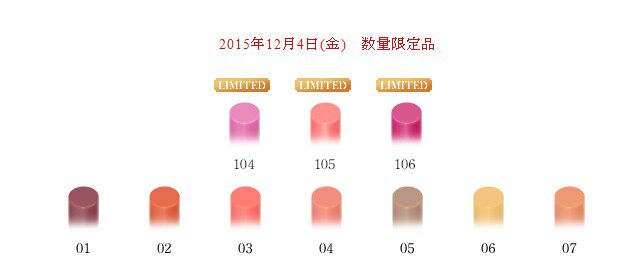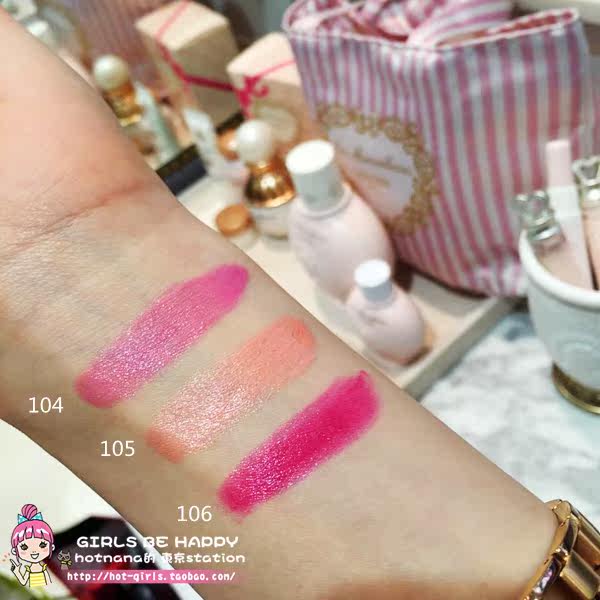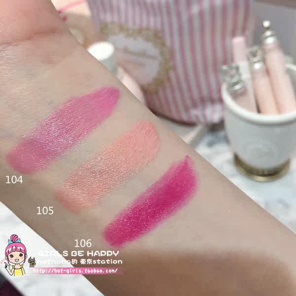 | | 掌柜推荐 | 2015年12.4号日本发售圣诞限定三色104 105 106:  微博红人@匿掉的熊崽试色说,冬季这款水润光泽的唇膏,01 05 07是带亮片闪的,所以质地没有其它几个色号润,01最显色,其次是02和03,最弱的就是04 05 06 07了。反正几个颜色我都好喜欢,嘻嘻,随便哪个颜色放在包包里,随时补妆,都觉得自己爆美腻。