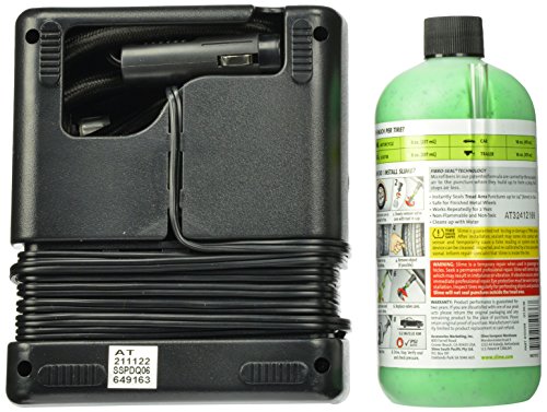 - Feature : Compressor has on/off switch, air hose w/locking nozzle, power outlet 12 Volt adapter power cord, 16 ounce bottle of Slime tire sealant, cap with valve core removal tool, hose adapter kit including 2 adapters