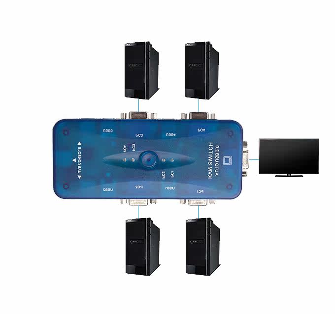 1套键盘、鼠标、显示器控制4台电脑;按键切换,也可热键切换,支持热机插拨,适用证券市场、教育等多种行业。
