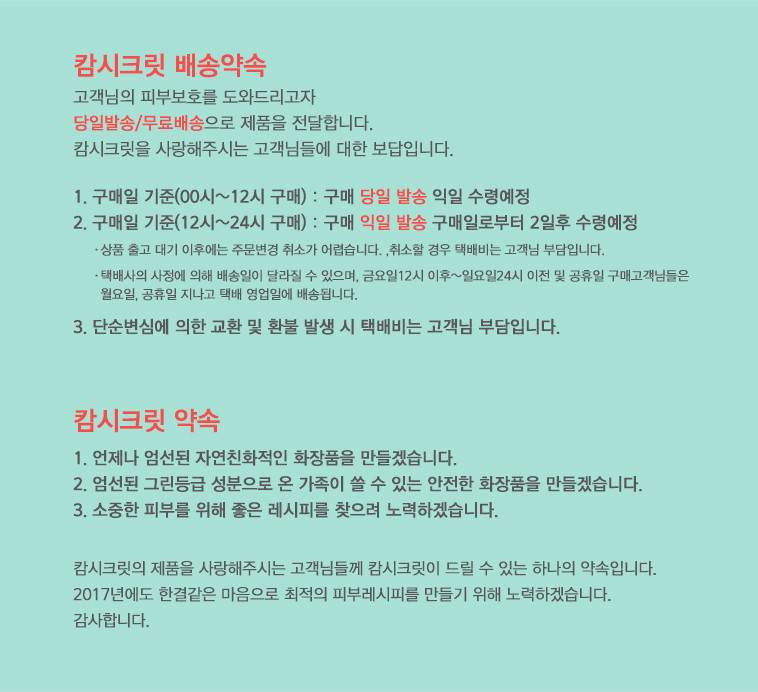 - 품질보증기준상품 구입 후 제품에 이상이 있을 경우, 캄시크릿 본사 고객센터를 통해 환불 및 교환을 받으실 수 있습니다. (구입 후 1년이내)