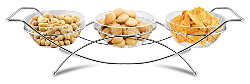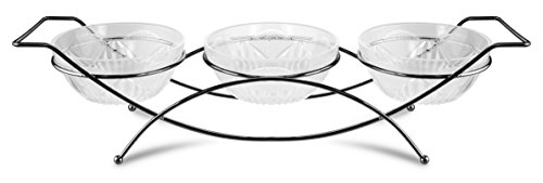 Add a beautiful touch of elegance with the KOVOT condiment server and dip bowl set. This 4 piece set includes: 1 chic metal caddy stand and 3 glass condiment bowls. The is a fun and functional serving tray for entertaining or everyday use. The glass bowls can be used with or without the stand. Ideal with serving dips, appetizers, fruit, dessert, or just displaying treats. The stand measures: 18" x 4 1/4" x 5 1/4" - bowls measure: 3" x 5" diameter. Hand wash recommended.Feature