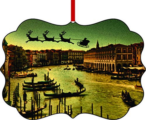 Vintage Santa and Sleigh Riding Over Venice-Italy-Benelux Aluminum Christmas Ornament with a Red Satin Ribbon/Holiday Hanging Tree Ornament/Double-Sided Decoration/Great Unisex Holiday Gift!
