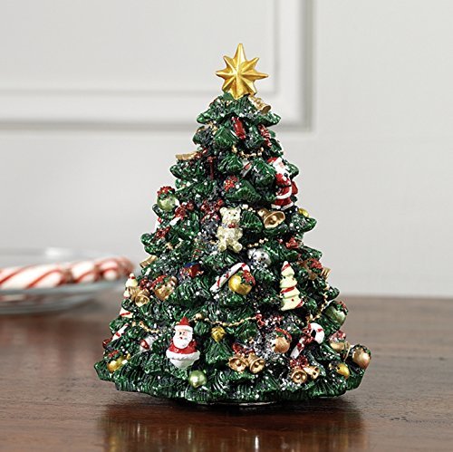 Studio : RAZ Imports Publisher : RAZ Imports Binding : Kitchen Product Description RAZ Imports xmas tree figurine. Rotating xmas tree measures 6 inches tall by 4.5 inches wide. Made of resin with painted finish. Musical xmas tree features ornaments, garland and star tree topper. Winds up and plays "We Wish You a Merry Christmas" while rotating 360°. A beautiful addition to your holiday decor. 0