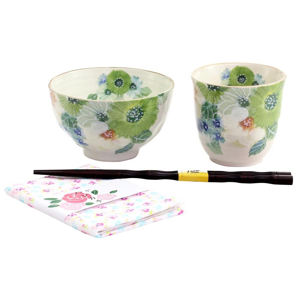 色鮮やかな花柄が美しい飯碗・湯呑・箸・ハンカチをセットにした一人用ギフトです。 |