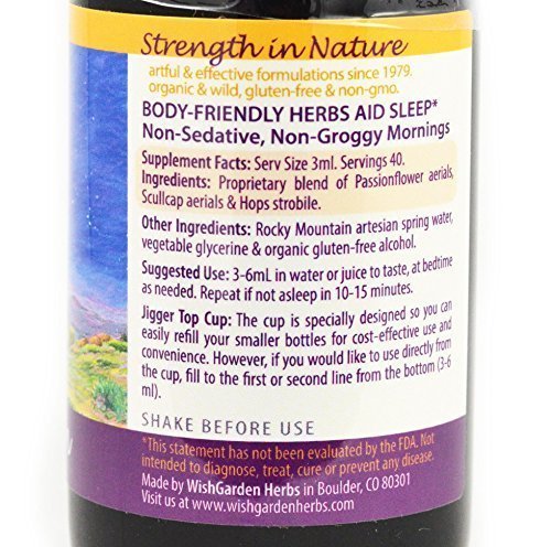 -. Binding : Health and Beauty -. Brand : Wishgarden Herbs -. EAN : 0656490555744 -. Feature : Herbal sleep aid.* / Supports healthy sleep cycles.* / No kava or valerian / on purpose!* / With New Jigger Top Cup! Simply pour to the desired dosage! No more guessing on how many "dopperful" to use. -. Label : WishGarden Herbs -. Manufacturer : WishGarden Herbs -. MPN : 6.56491E+11 -. PartNumber : 6.56491E+11 -. ProductGroup : Health and Beauty -. ProductTypeName : HEALTH_PERSONAL_CARE -. Publisher : WishGarden Herbs -. Studio : WishGarden Herbs -. Title : Sleepy Nights - 4 Oz -. UPC : 656490555744