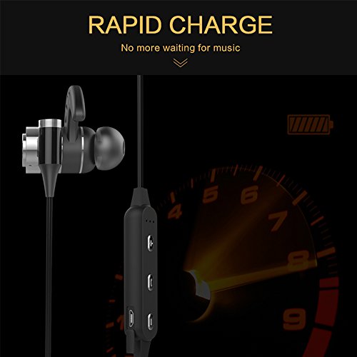-. Feature : Headphones,advanced CSR4.1 bluetooth makes the connection faster and more stable,and compatible with 99.9% bluetooth device,such as iPhone and Android phones, and also plenty of other Bluetooth devices. / Earphones,high fidelity stereo sound with aptX codec,support up to 6 hours talk/music time (depends on volume and audio content) and 240 hours standby time. Only charge about 1 hour to get full energy back. / Headsets,premium metal texture magnetic design make both earpieces can attach to each other like a necklace around your neck when not in use,looks cool and instantly access your earphones anytime without searching your pockets. / Bluetooth earbuds,soft earbuds and ear hooks provide a comfortable, snug fit.4 pairs of interchangeable earbuds can fit all type of ears .Hands-free call with CVC6.0 noise cansellation mic,you can have a call clearly anywhere.The earphones battery level display on the smartphone screen,which can help you to allocate the time reasonably. / Wireless earphones,33 feet distance of connection.Package included: bluetooth earphones ,ear hooks ,interchangeable earbuds,a USB charge cable and a storage bag.
