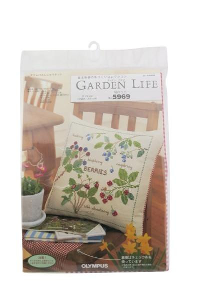 | リビングを中心としたインテリアを意識した、ガーデニングのある生活。クッションの裏側にチェック布を使用。技法はクロスステッチ。技術レベルは初級~中級者向。 |