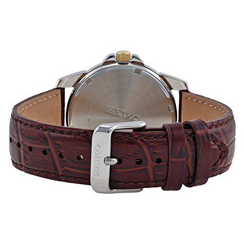 갈색의 가죽 스트랩과 스테인레스 스틸의 케이스.골드 톤의 고정 베젤.골드 톤의 손과 인덱스의 시간 마커를 가지는 청색의 다이얼.바깥쪽의 인연의 주위분의 마커.다이얼타입: 아날로그.3 위치에 요일과 날짜 표시 일(날).솔라 쿼츠.상처가 부착 어려운 하드렉스 크리스탈.솔리드 케이스 백.케이스 직경: 37 mm.케이스후: 케이스 형상 라운드 10 mm..밴드폭: 19 mm 당clasp.수 내성 100 미터/330 피트.기능: 날짜,daqy,시간,분,초입니다.캐주얼 손목시계 스타일.세이코 솔라 맨즈 손목시계 기능 SNE102.