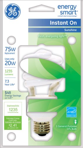 Studio : GE Lighting Publisher : GE Lighting Binding : Tools Home Improvement Product Description GE 20 Watt Energy Smart Instant-on Sunshine CFL (75 Watt equivalent) Light Bulb 1PK # 71764 For product questions regarding GE Lighting products, please call GE Hotline 1-800-435-4448, Monday ? Friday, 8:00 a.m. - 6:00 p.m. EST Follow the recording prompts or ‘stay on the line’ to speak directly to a customer service rep. 0