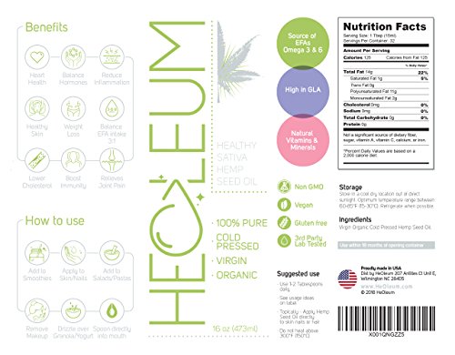 THE HOLY GRAIL OF HEALTHY OILS. Consumer's and health pro's are figuring out why eastern medicine gave hempseed this moniker. Provides the ideal 3:1 Omega Fatty Acid balance for your diet. Improves cardio. Cures Acne w/o clogging pores. Moisturizes skin, hair & nails. Weight loss thanks to high CLA. Almost endlist list of health benefits.