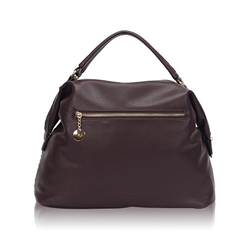 -. Feature : Smooth faux leather; Light gold hardware / Textured design; Zipper closure; Back zip pocket; Embossed signature logo / 2 interior zip pockets; 3 slip pockets; Textile lining / Measurements: 10" x 14.75" x 6.75" (H*W*D); Handles, 5.5" / Available in black, dark maroon