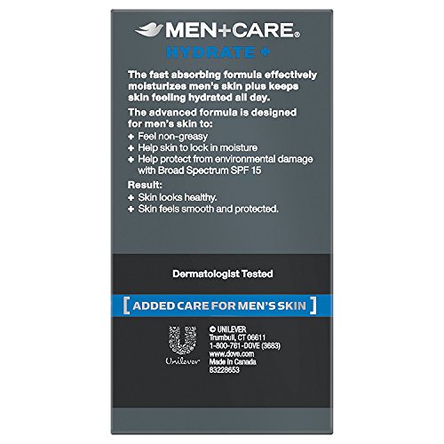 -. Binding : Health and Beauty -. Feature : Pack of 2, Each is 1.69 ounce / Broad spectrum SPF 15 sunscreen / Keeps skin feeling hydrating all day / Non greasy formula, absorbs quickly without sticky feel -. IsAdultProduct : 0 -. Label : Dove -. Manufacturer : Dove -. PackageQuantity : 2 -. ProductGroup : Health and Beauty -. ProductTypeName : HEALTH_PERSONAL_CARE -. Publisher : Dove -. Studio : Dove -. Title : Dove Men+Care Face Lotion, Hydrate+ 1.69 oz (Pack of 2)