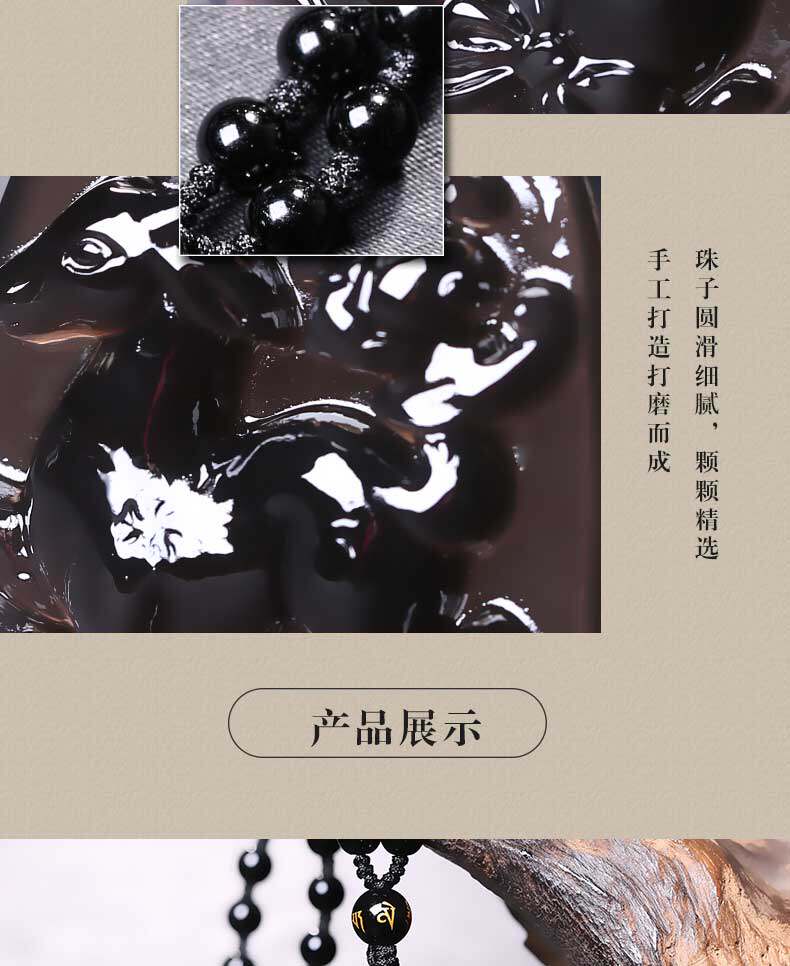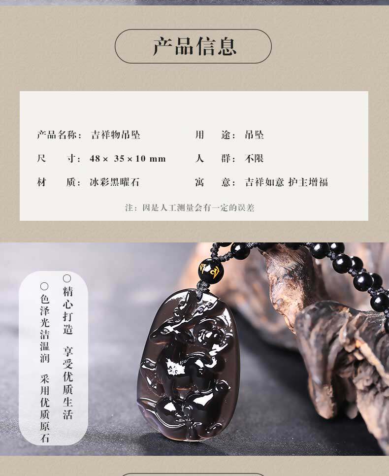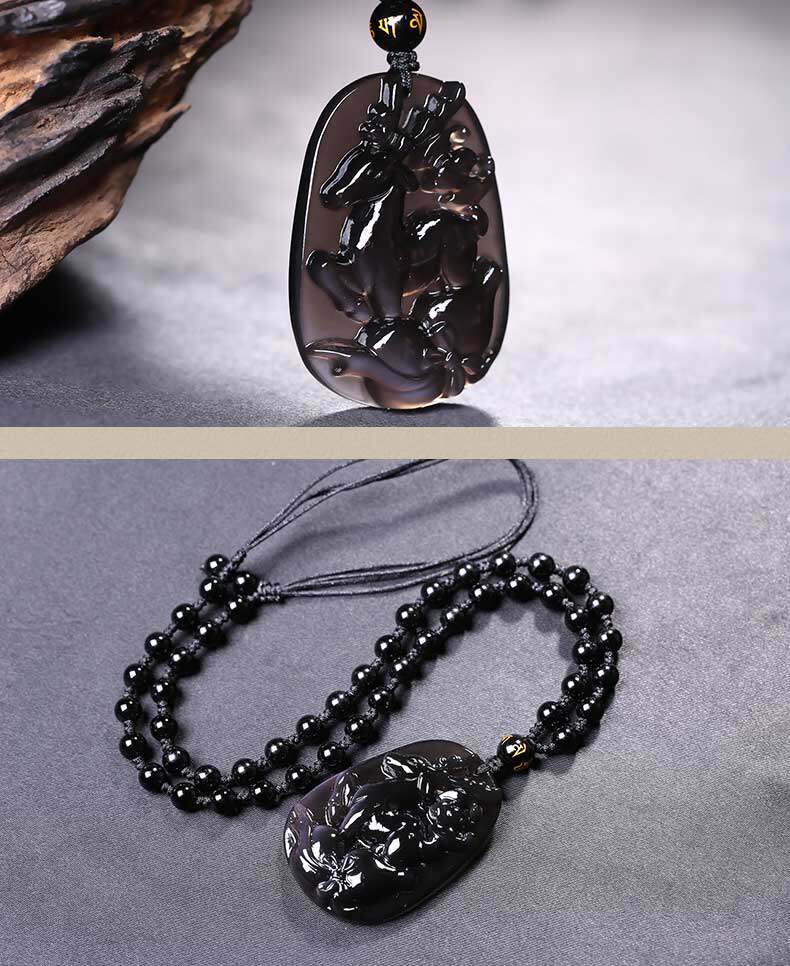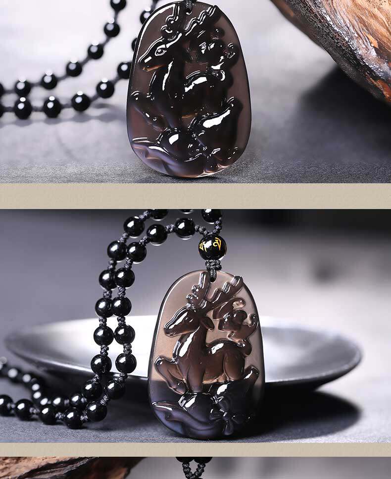 开光 祥鹿采芝属虎吊坠生肖吉祥物冰种黑曜石男女款项链