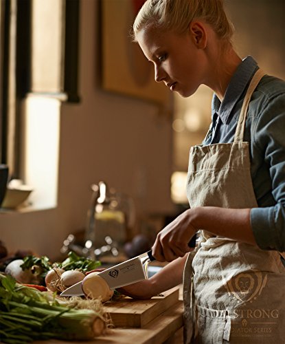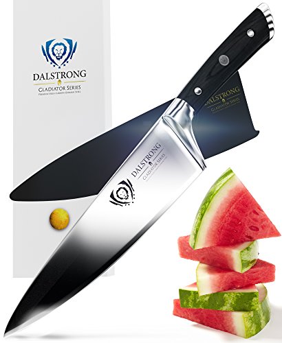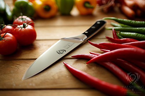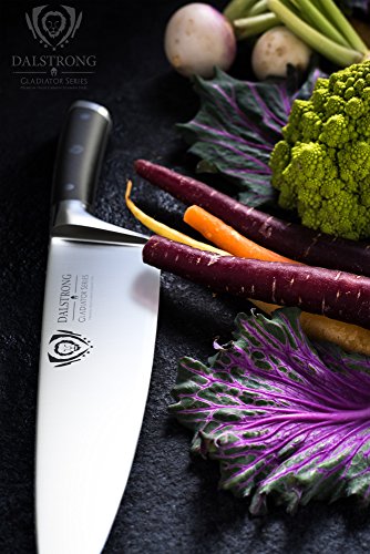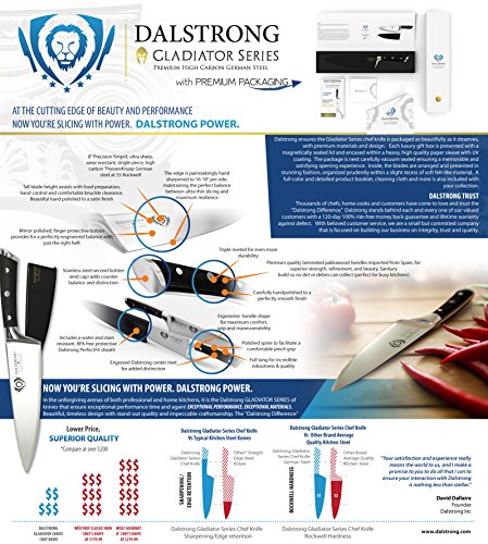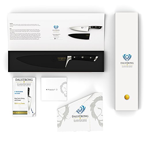 ? Precision forged, ultra sharp, wear resistant, single-piece, high carbon ThyssenKrupp German steel at 55 Rockwell ? The edge is painstakingly hand sharpened to 18° per side, maintaining the perfect balance between achieving ultra thin slices and maximum resilience ? Tall blade height gives knuckle clearance to assist with food preparation and chopping activity ? Beautiful hand polished satin finish blade ? Tapered design for hardness and flexibility ? Stain resistant ? Precisely tempered ?Polished spine to facilitate a comfortable pinch grip ? Full tang for incredible robustness & quality ? Premium quality laminated pakkawood handles imported from Spain, for superior strength, refinement, and beauty. Sanitary build perfect for busy kitchens ? Triple riveted for even more durability ? Mirror polished, finger protective bolster provides for a perfectly engineered balance with just the right heft ? Ergonomic handle shape for maximum comfort, grip and maneuverability ? Sharpens easily ? Stainless steel (end cap) adds counter balance and distinction ? Engraved Dalstrong center rivet ? Cleans easily for low maintenance ? Includes a BPA free protective Dalstrong PerfectFit sheath INCLUDES (1)Chef Knife (8") (1) BPA free Polymer Sheath (1)Polishing Cloth (1)Exquisite Gift Packaging (1)Full Color Guide Booklet