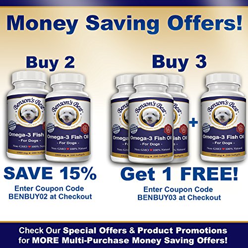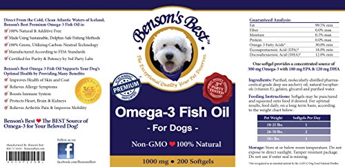 -. Title : Benson's Best Omega-3 Fish Oil for Dogs (1000 mg Softgels) or Cats & Small Dogs (500 mg Softgels) - Provides 43% More Omega-3 Fatty Acids than Salmon Oil! 180 Softgels - 100% Pure, Non-GMO, Natural Pet Food Supplement