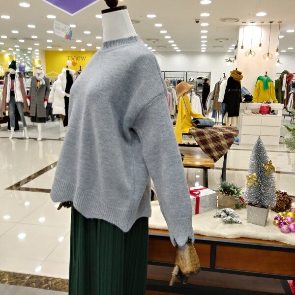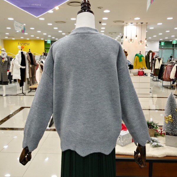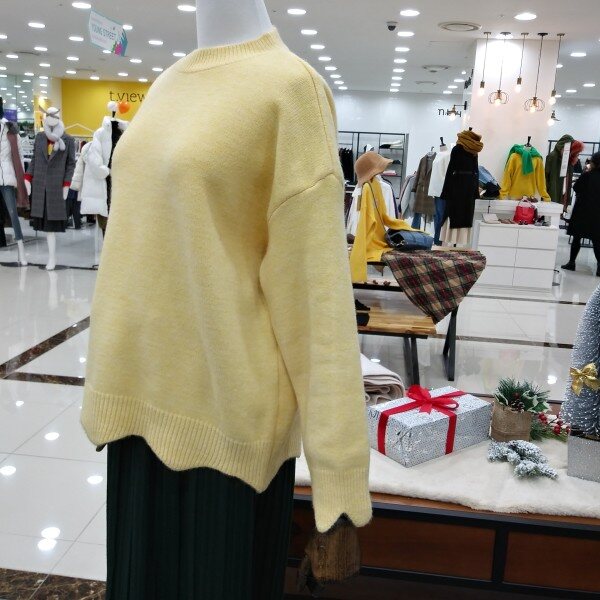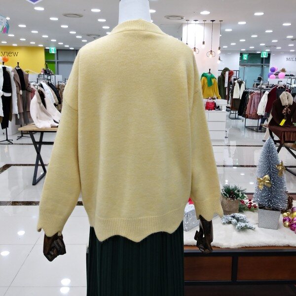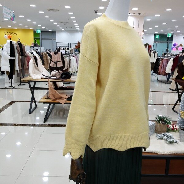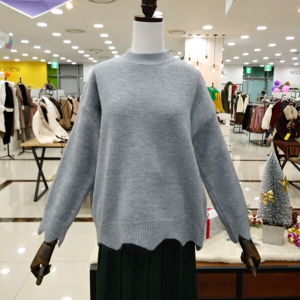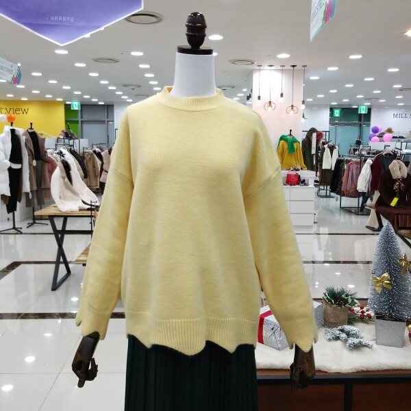 깔끔한 라운드넥의 소매단과 밑단 물결모양으로 포인트들어간 여성스러운 언발니트티 이에요