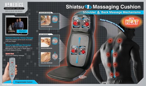 - Feature : Two separate massage mechanisms for the shoulder and back / The shoulder massage mechanism includes a height adjustment to customize your massage / The back massage mechanism has spot shiatsu and width control to provide targeted relief for the back / Both massage mechanisms provide quick heat on demand / 6 programs to choose from