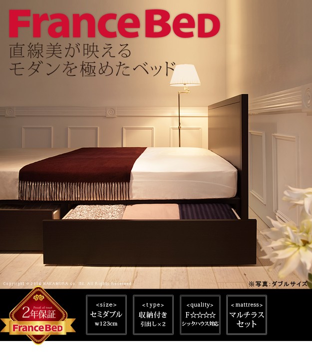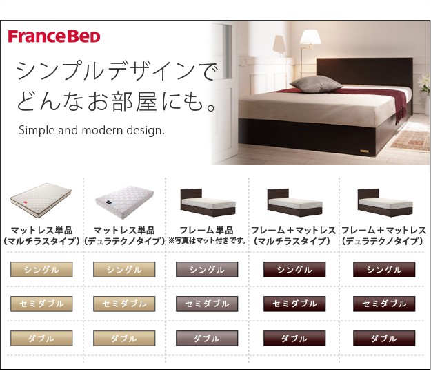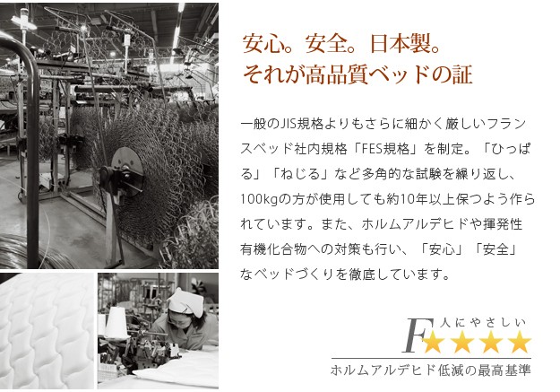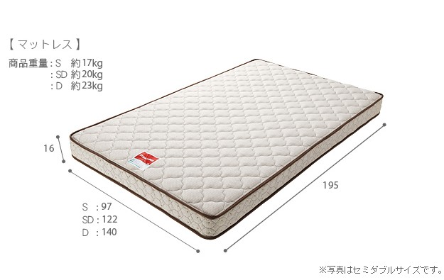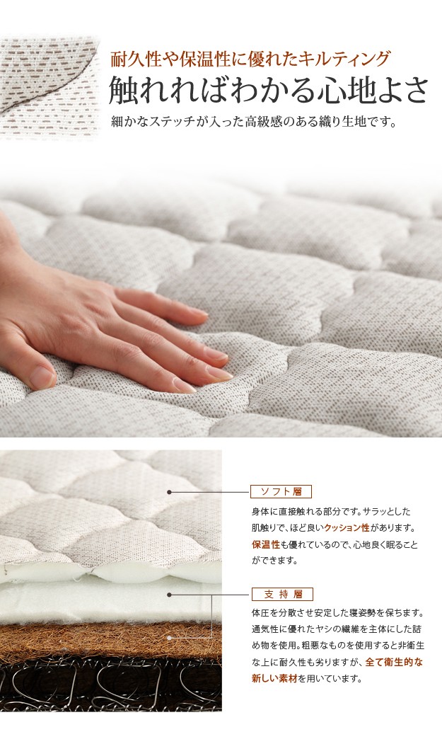 材質:[ベッド]本体-プリント紙化粧合板、[マットレス]張地-ポリエステル64%・綿27%・レーヨン9%、中身-ウレタンフォーム・パームパッド・ポリエステル綿・防虫不織布、コイル-マルチラススーパースプリング・コイル数1026、通気孔-アイレット加工