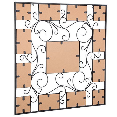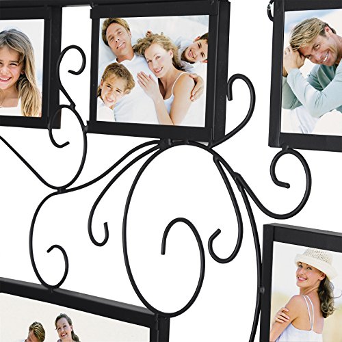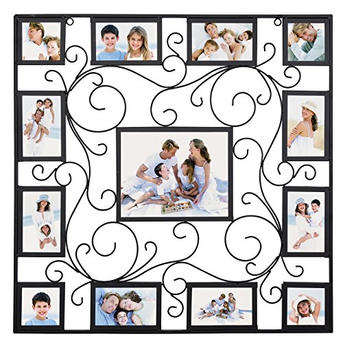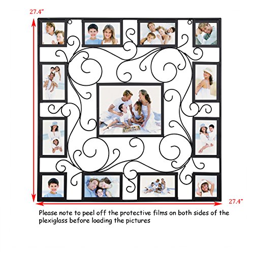 -. Feature : MATERIAL---frame constructed of high quality iron,very sturdy and durable; front cover is plexiglass, protecting your photos from dust and moist / DESIGN---Square shape with scrolls pattern, plus black finish, looks very unique and antique / LAYOUT---Attractive "Puzzle" layout with entire size 27.4x27.4",holding eight 4x6" images, one 8x10" and four 3.8x3.8" images / FUNCTION---Preserve and showcase your lovely photos and serve as an a trractive wall décor itself / USAGE---Load your favorable photos easily with bendable pins and removable back panel