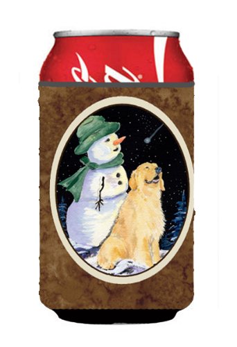 Golden Retriever with Snowman in Green Hat Can or Bottle Beverage Insulator Hugger