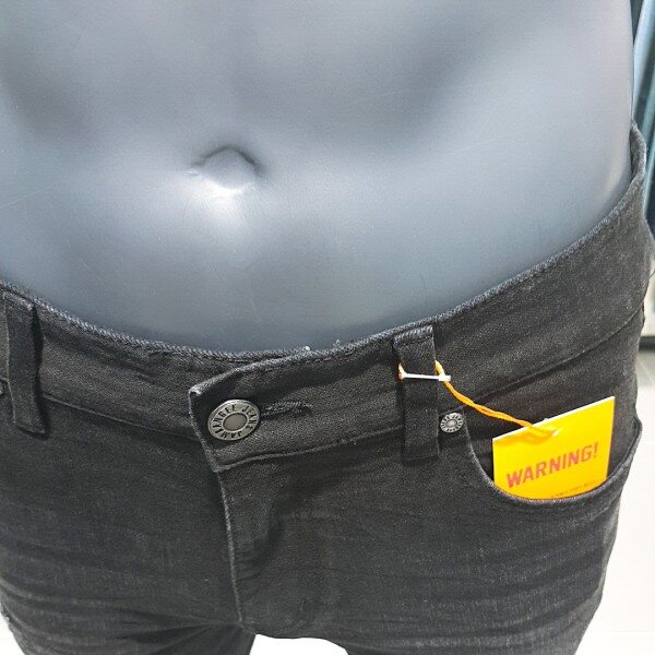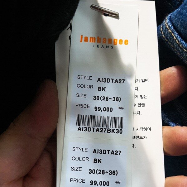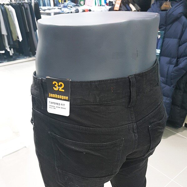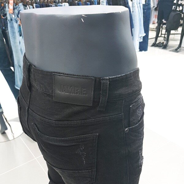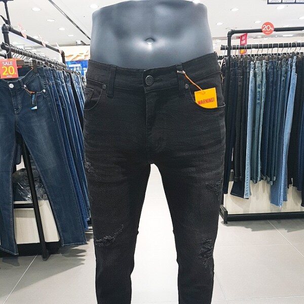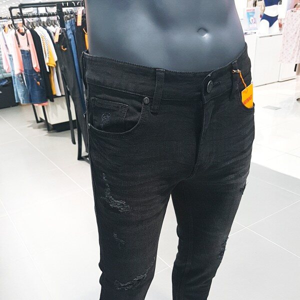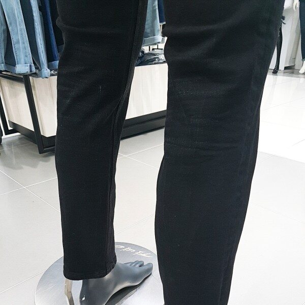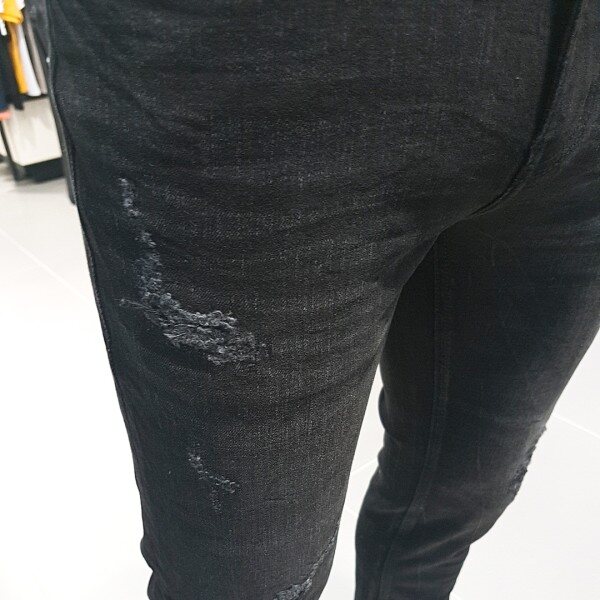 블랙 칼라 캣엠보 시와 워싱에 과감한 라텍스 구제와 누빔 스티치로 포인트를 준 남성용 TA핏 데님 스타일.