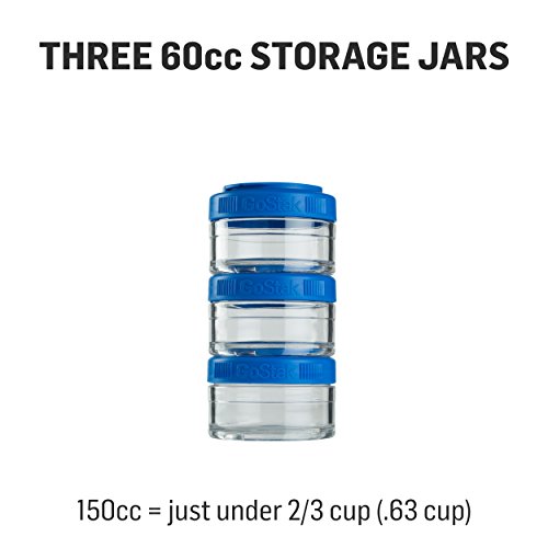 -. Feature : These compact and sleek jars are designed so you take only what you need, without taking up a lot of space in your gym bag / This pack includes three (3) 60cc jars / The GoStak features "Twist n' Lock" technology, which allows you to easily attach jars to each other in any order and any size; A quick, quarter-turn locks these jars together / These jars are stain and odor resistant, so your jars remain clean, clear and fresh, regardless of what they carried the day before; Made of durable Eastman Tritan plastic / The GoStak fits inside the Blender Bottle Classic or Blender Bottle SportMixer, for compact traveling