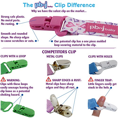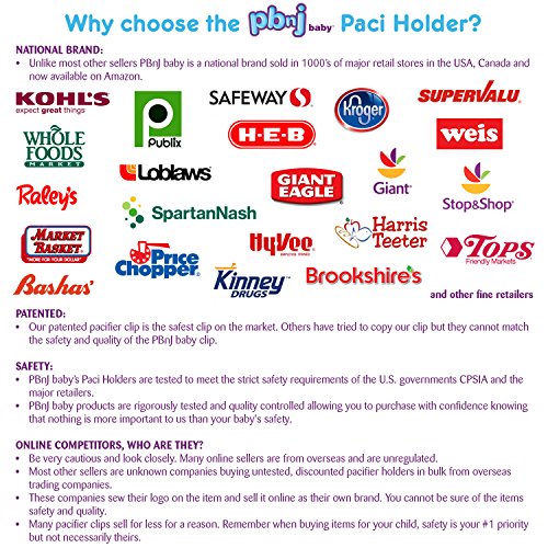 -. Feature : A NATIONAL BRAND - Unlike most other sellers, PBnJ baby is an established national brand selling in major retailers like Kohl's, Kroger, Whole Foods, Safeway, Publix and 1000's of other retail stores. / SAFETY - All products are tested to meet the strict safety requirements of the CPSIA and major retailers. PBnJ baby products let you purchase with confidence knowing that nothing is more important than your baby's safety. The Paci Holder helps keep floor germs, bacteria and dirt off your baby's items. Paci Holder is perfect for on-the-go babies who lover their pacifier! / PATENTED - Paci Holder has a patented clip allowing you to safely, quickly and easily secure to all brands of pacifiers. Safe, smooth design with one-handed open/close. No unsafe metal clip! No rusting, sharp edges or small metal parts. Strong clasp that is gentle on baby's clothes. See images to learn more! / COMPETITORS, WHO ARE THEY? Most other sellers are unknown companies buying untested, discounted pacifier holders in bulk from overseas trading companies. Many pacifier clips sell for less for a reason. Remember when buying items for your child, safety is your #1 P.R.Iority but not necessarily theirs. Safety and quality is PBnJ baby's #1 P.R.Iority. / GUARANTEE - As a national brand, PBnJ baby stands behind their products. If you are ever unhappy with the product return it for a full refund. See why buyers at major retailers choose the Paci Holder over the others. So, if you are tired of playing the "Dropsy" game, don't wait, order now.