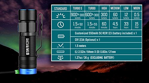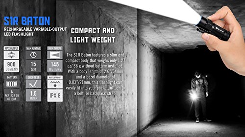 SUPER BRIGHT - Olight S1R doubled the output of popular S1 and S10R. It bursts 900 lumens for 30 seconds when you need maximum impact then it steps down at still very bright 300 lumens to extend the battery run time.