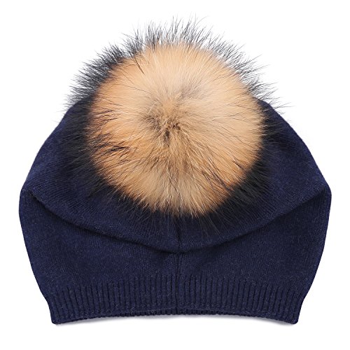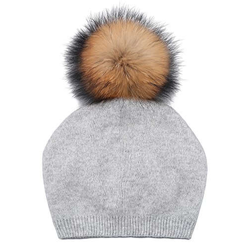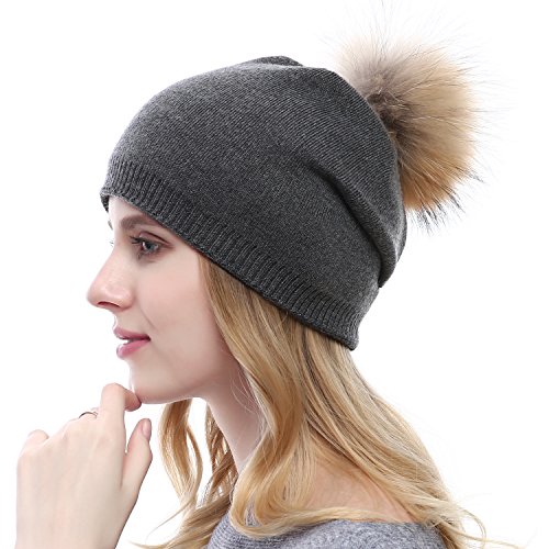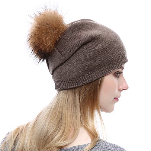 | QUEENFUR Women Knit Wool Beanie - Winter Solid Cashmere Ski Hats Real Raccoon Fur Pom Pom |