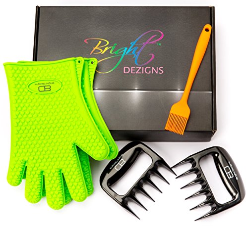 Silicone Gloves, 2 Extra Sharp Bear Claws with Silicone Basting Brush, Holiday Season Great Gift Idea, Stocking Stuffer for Mom,Dad - Him - Her - Man - Woman, Versatile 3 in 1 Grilling Accessories Set is Uniquely Packaged ready to give in our Delightful Bright Dezigns Gift Box Makes a Perfect Holiday Season Gift.