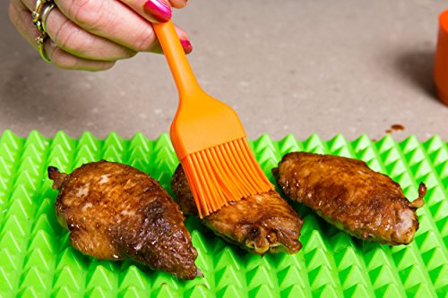 Idea for the Home Cook/Chef 3 in 1 BBQ Accessories Grill Set Superb Quality Durable Green Heavy Duty Silicone Heat Resistant Gloves includes Orange Basting Brush Together with Solidly Designed & Constructed Poly-Carbonate Bear Claws. Each Product is FDA Approved, BPA Free and Dishwasher Safe. Look for our matching BRIGHT DEZIGNS PYRAMID BAKING MAT SET to compliment your purchase.