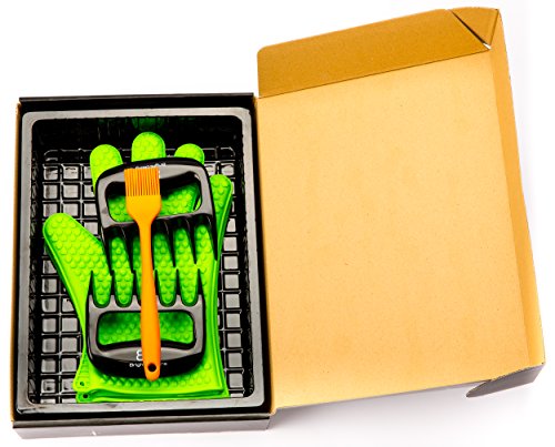 Heat Proof Silicone Gloves for Grilling, Oven, BBQ. Silicone Basting Brush and Bear Claws Meat Shredder 3 in 1 barbecue set ideal for lifting roasts and pulling meats. Gift boxed