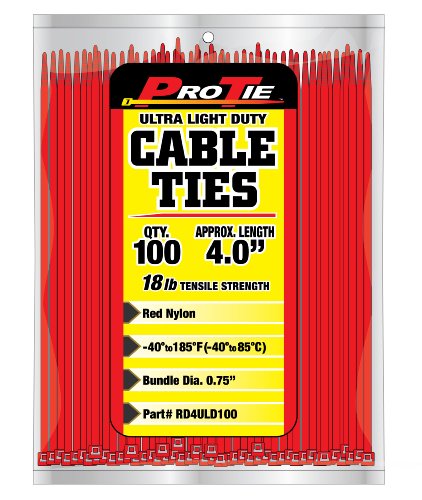 Pro Tie RD4ULD100 4-Inch Red Ultra Light Duty Color Cable Tie, Red Nylon, 100-Pack